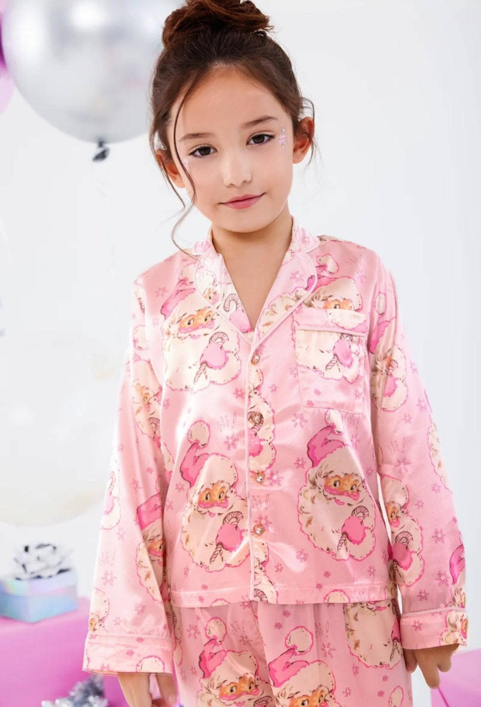- Experience holiday joy with this festive silk set, featuring an adorable Santa Claus print on a vibrant pink background.